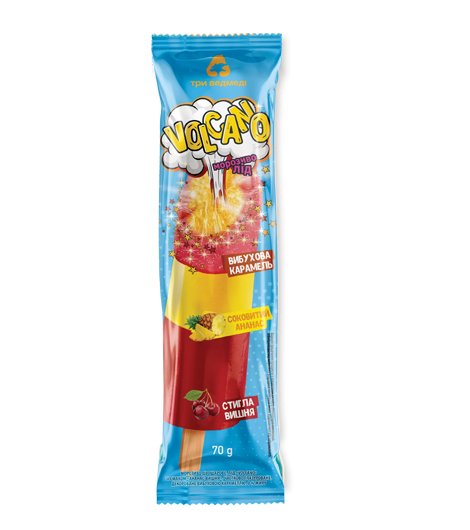 Παγωτό γρανίτα δύο στρώσεων «Volcano» με γεύση «Ανανάς-κεράσι», μερικώς γλασαρισμένο, διακοσμημένο με ζαχαρωτά, περιεκτικότητα σε λιπαρά – 0 %. 70γρ.