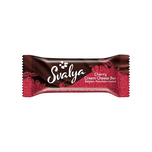 SVALYA cream cheese bar with cherry, Belgian chocolate coating, 40g. It’s healthy and natural snacks. Made from fresh natural milk and covered with real Belgian chocolate. True indulgence for everyone. Product can be frozen.
