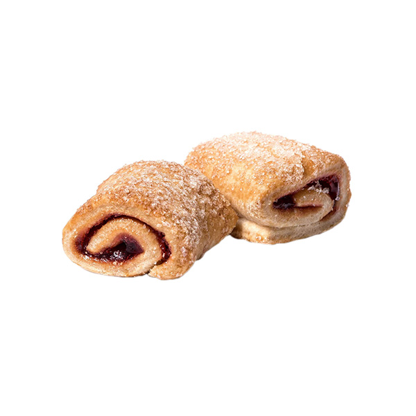Roll-shaped cookies with fruit filling. The surface is decorated with sugar powder