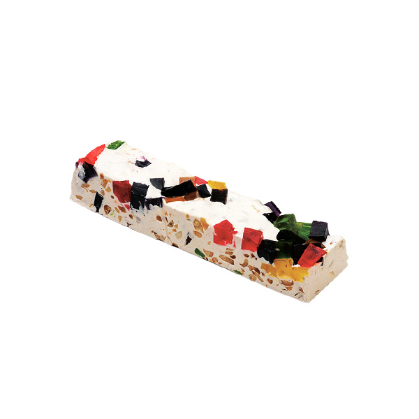 Whipped the whites caramel mass with peanuts, decorated with pieces of marmalade