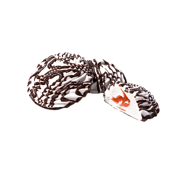 Zephyr with strawberry flavored filling, the bottom and surface are decorated with dark confectionery coating